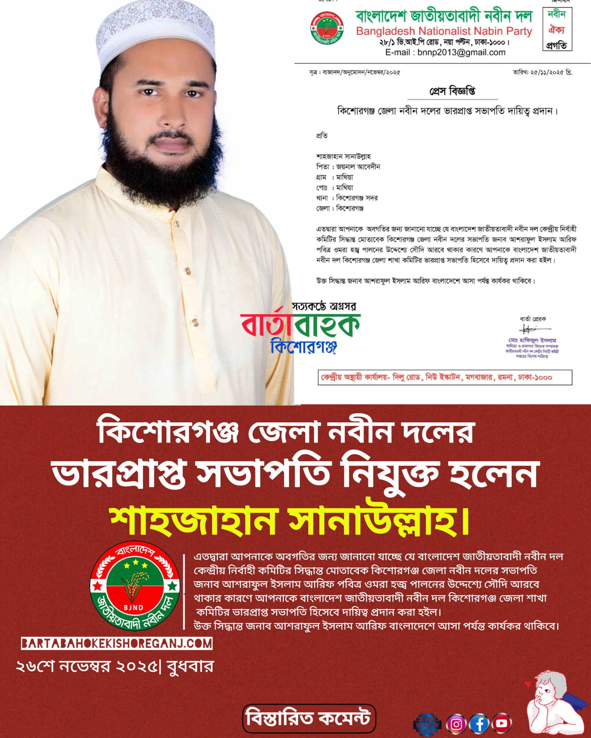 প্রেস বিজ্ঞপ্তিতে জানানো হয়, কিশোরগঞ্জ জেলা নবীন দলের সভাপতি আব্দুল্লাহ আল-আমিন আরিফ বর্তমানে পবিত্র ওমরাহ হজ পালনের উদ্দেশ্যে সৌদি আরবে অবস্থান করছেন। তার অনুপস্থিতিতে সাংগঠনিক কাজ গতিশীল রাখতে শাহজাহান সানাউল্লাহকে ভারপ্রাপ্ত সভাপতি হিসেবে দায়িত্ব অর্পণ করা হয়েছে।