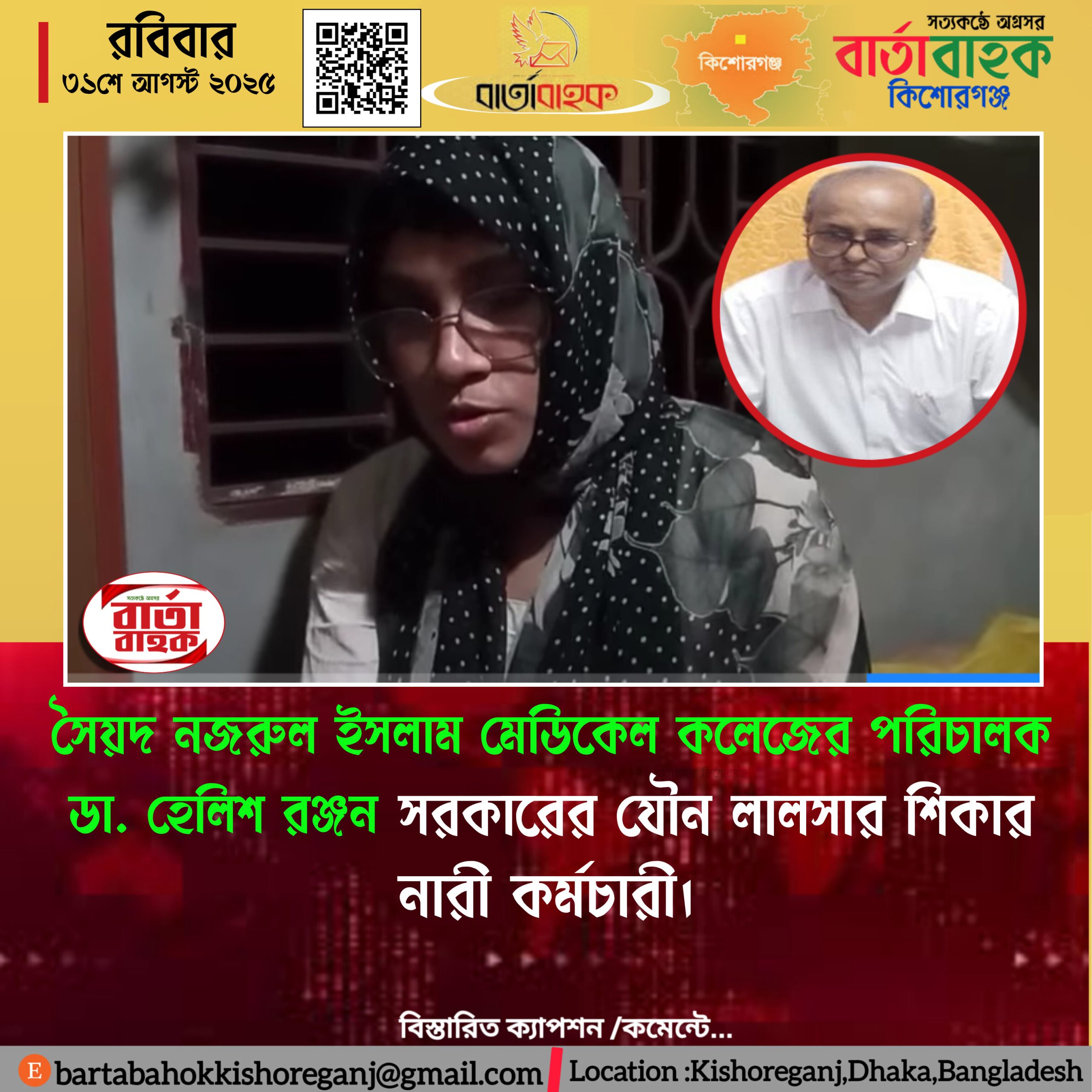 কিশোরগঞ্জ শহীদ সৈয়দ নজরুল ইসলাম মেডিকেল কলেজ ও হাসপাতালের পরিচালক ডা. হেলিশ রঞ্জন সরকারের বিরুদ্ধে দীর্ঘদিনের অনৈতিক সম্পর্ক, হুমকি ও আর্থিক অনিয়মের অভিযোগ প্রকাশ্যে এসেছে।