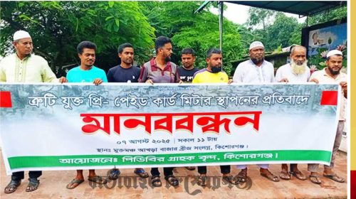 ত্রুটিপূর্ণ প্রি-পেইড ত্রুটিপূর্ণমিত্রুটিপূর্ণটারত্রুটিপূর্ণ স্থাপনের প্রতিবাদে কিশোরগঞ্জে মানববন্ধন